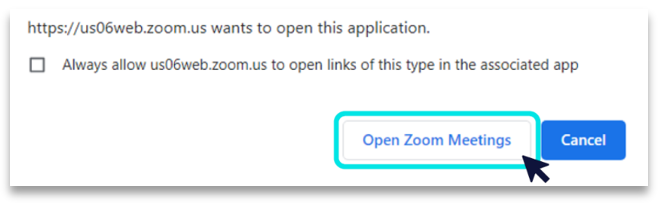 - Step 3: The confirmation email contains the “Join Meeting” link. Use it to log in to your subject session on the day. The link will direct you to the Zoom app, where a pop-up will appear on your screen. Click “Open Zoom Meetings.”