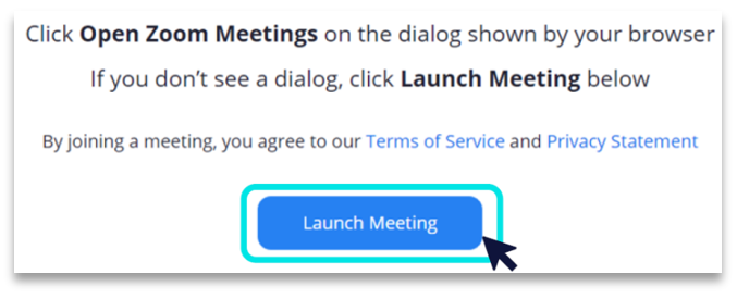 If the pop-up doesn’t appear, click “Launch Meeting” on the main Zoom page. If you experience any further issues, you might need to do the following