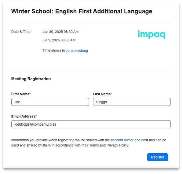 - Step 2: Click on the Meeting link in the abovementioned email. You will be directed to a registration page like the one shown below. Fill in your details, then click “Register”. A confirmation email with login details will be sent to the provided email address.